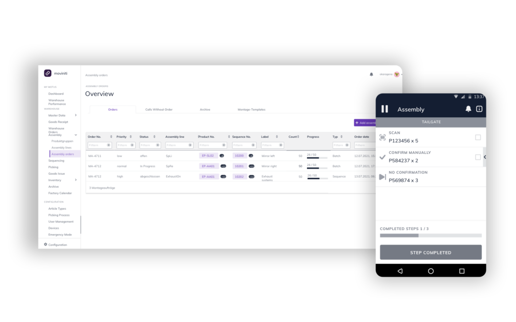 Easy configuration on the web, warehouse order execution via scanner & assembly orders via monitor