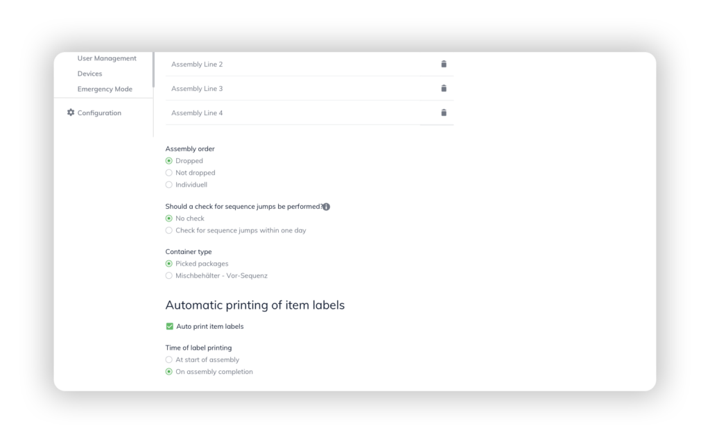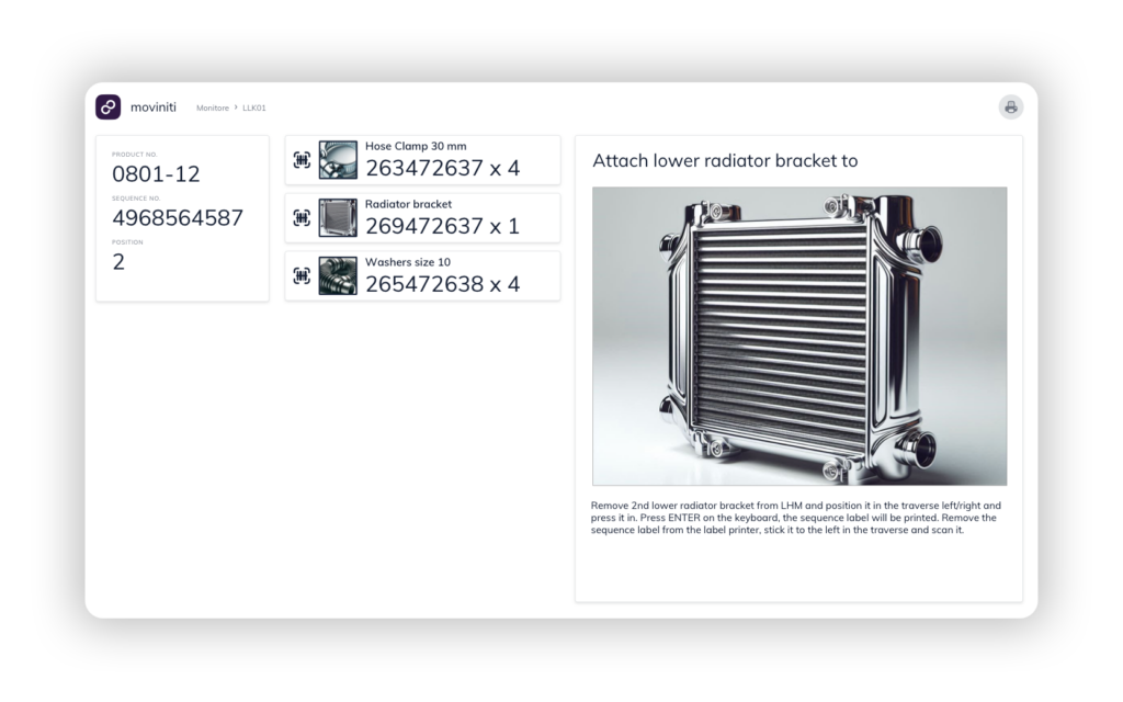Visualization of all warehouse processes related to assembly, as well as digital process guidance for assembling semi-finished or finished products. Suitable for logistics service providers who need to supply components just-in-sequence or by batch, or for manufacturers of their own products.